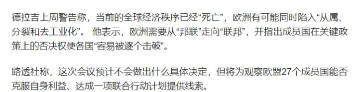 德拉吉说,以前支撑欧洲繁荣的全球秩序,现在已经碎得差不多了,要是欧盟还是这么松散,各玩各的,取消不了关键议题的一票否决权,搞不成联邦化,最后只会变成中美博弈的附庸,陷入分裂和产业空心化的死循环。